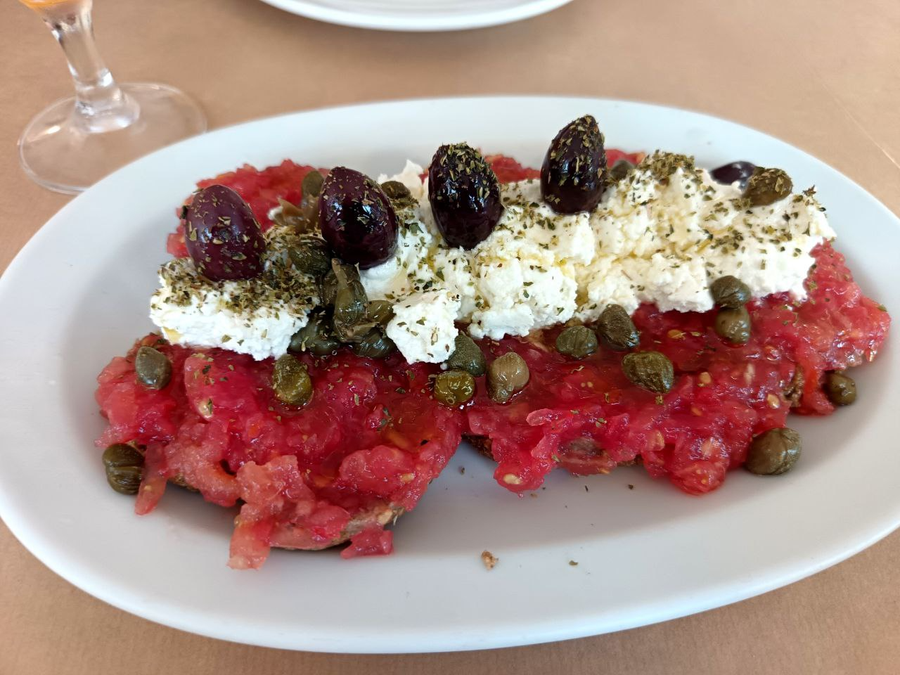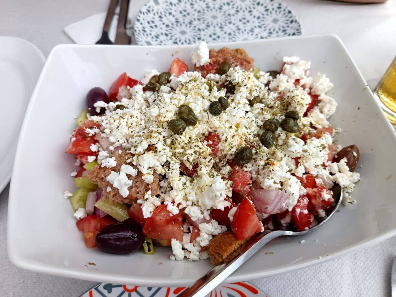 Let's switch our focus off the Baklava and talk about the Dakos salad. They served us this big bowl of salad with some kind of croutons in it that they call "rusks". All the other ingredients like tomatoes, cheese, capers, olives, and others tasted so fresh, it changed my view on salads. Before this trip, I was never really a fan of salads. I even disliked tomatoes at some point while living in Austria. Aside from a few exceptions, whenever I hear "salad" in the West, I think about lettuce and I find that so boring. On our first week of arrival in Austria, Dakos salad was one of the first dishes I made. I really liked it a lot.